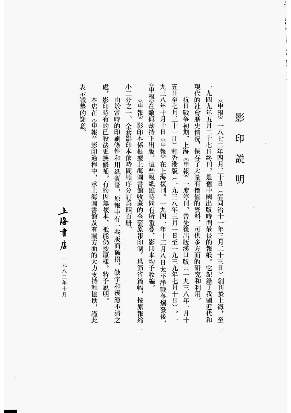 是舊中國出版時間最長的報紙。它記錄了我國近代和現代的社會歷史情況,保存了大量有價值的資料,可供多方面的研究和利用。抗日戰爭初期,上海《申報》一度停刊,曾先後出版漢口版(一九三八年一月十五日至七月三十一日)和香港版(一九三八年三月一日至一九三九年七月十日)。一九三八年十月十日〈〈申報》在上海復刊。一九四一年十二月八日太平洋戰爭爆發後,《申報〉在敵偽劫持下出版。這些報紙雖時間有所重蠱,影印本均予收編。《申報》影印本係根據上海圖書館收藏的全套原報印制。為節省篇幅,按原報縮小二分之一。全套影印本依時間順序分訂為四百冊。由於當時的印刷條件和用紙質量,原報中有一些版面破損、缺字和漫漶不清之處,影印時有的已設法更換修補.,有的因無复本,只能仍按原樣,特予說明。本店在《申報》影印過程中,承上海圖畫自館及有關方面的大力支持和協助,謹此表示诚挚的谢意。
