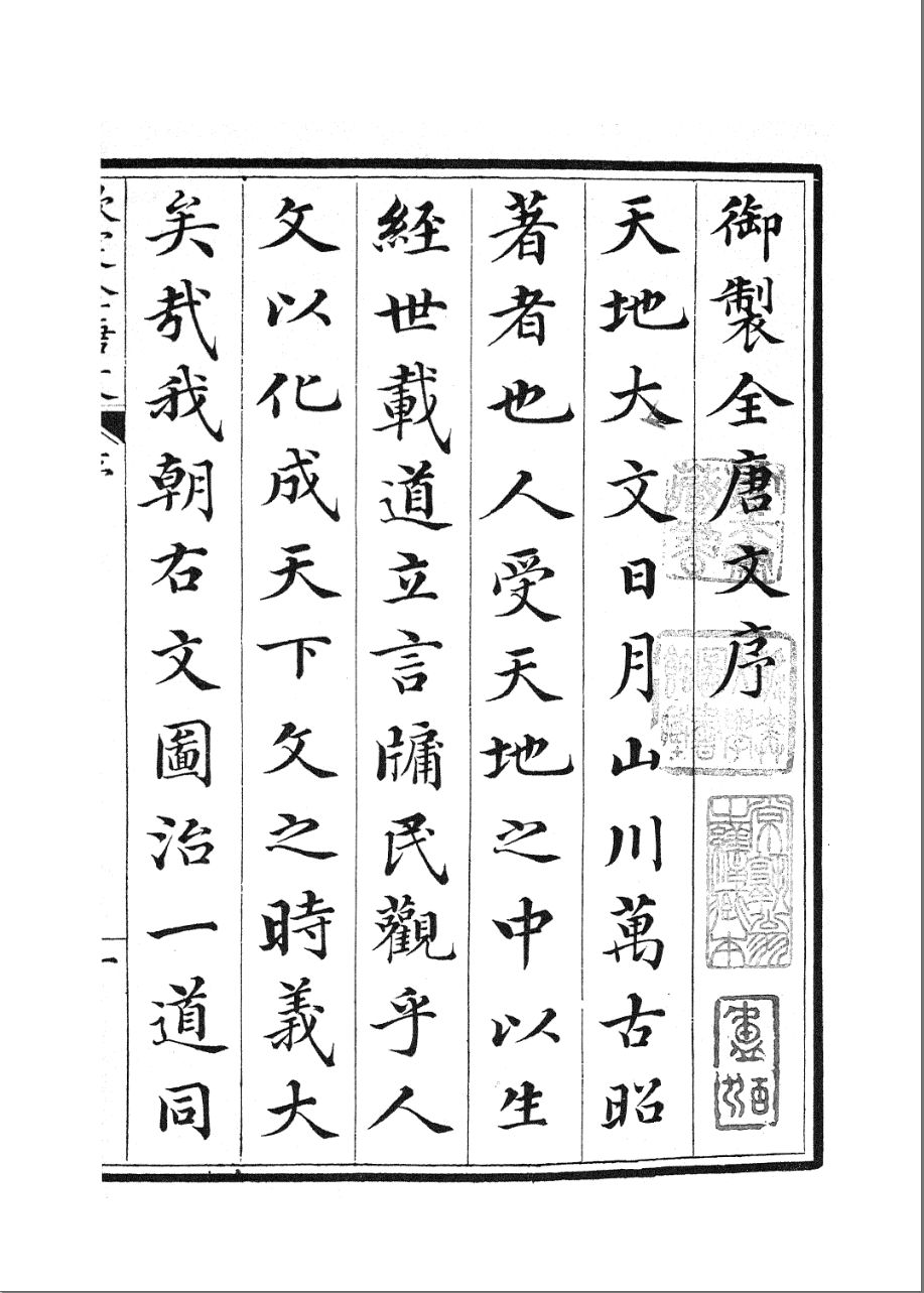 《钦定全唐文》,1000卷,卷首四卷,清董诰、阮元、徐松等奉诏编纂,清嘉庆二十三年(1818年)扬州局刻本。半页9行,行22字,白口,四周双栏,版框19.9cm×14.5cm,共1004册。卷首有嘉庆十九年御制序、二十三年御制读《全唐文诗》一首,董诰等进书表及纂修诸臣职名。
