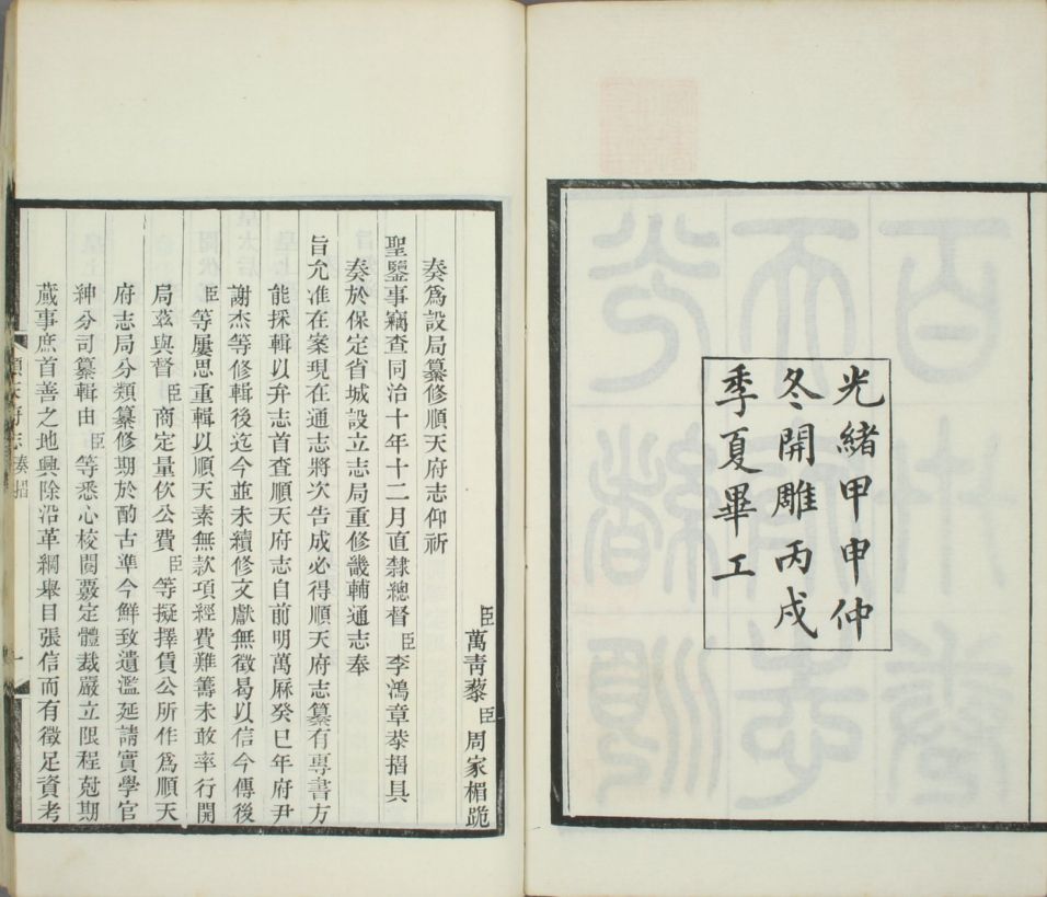 《光绪顺天府志》 是保存较为完整的一套志书。光绪五年(1879)设局修纂,十二年(1886)成书,计一百三十卷。书中占用很大篇幅记叙了顺天府的水道、水利情况,沿革、官守等都从周代一直记载到清末,为晚清衰败时期的地方巨著。这套志书为我们提供了较为系统完备的历史资料,具有重要的实用价值。