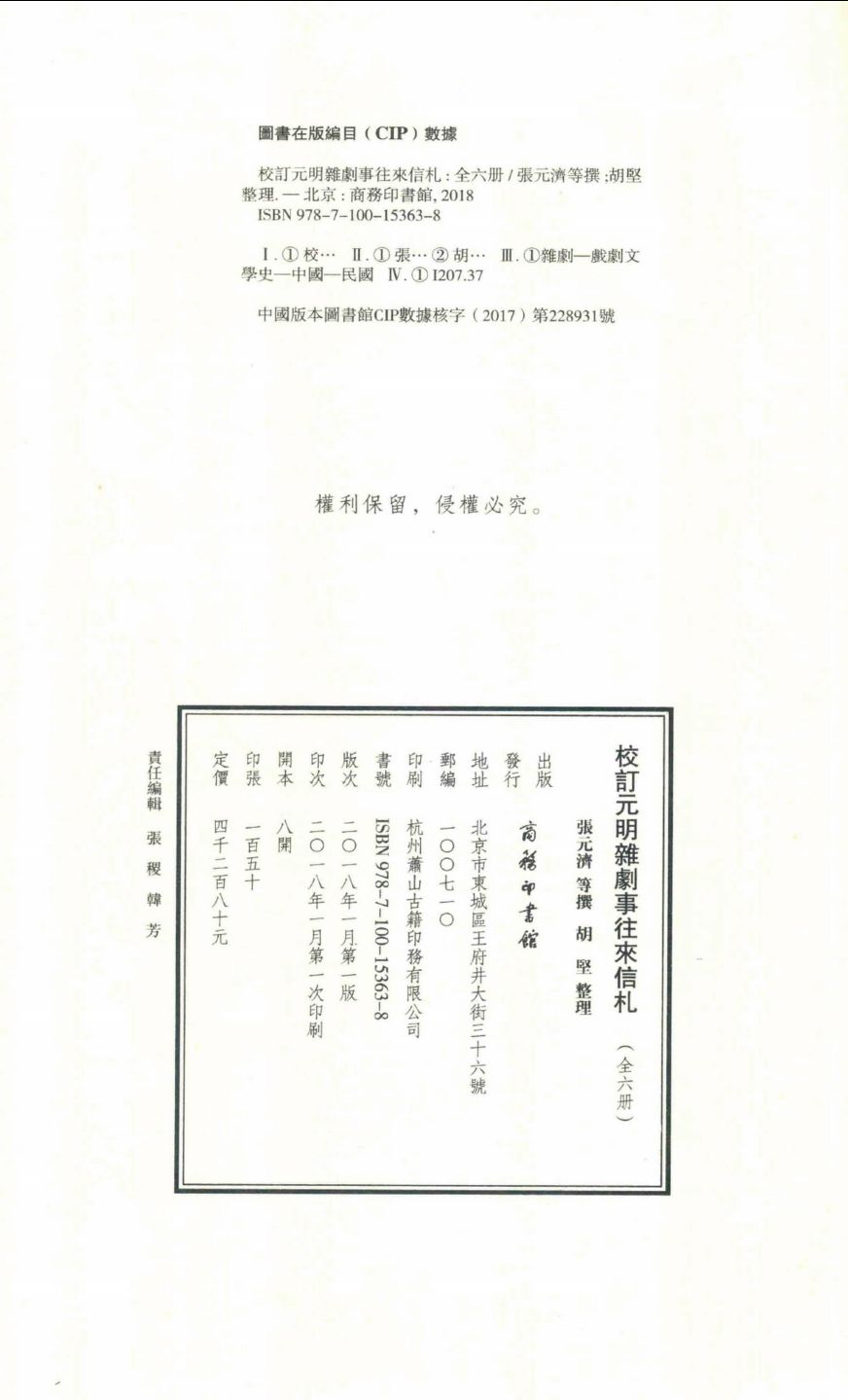 也是园旧藏虞山丁氏元明杂剧,民国廿七年由苏垣散出,辗转被北平图书馆购得,并同意由商务印书馆影印二百四十二种,有刊本、抄本,行款各不同。张元济请王季烈整理、校订。《校订元明杂剧事往来信札》起自民国廿八年四月廿四日,止于民国廿九年元月三十日,真实反映、记录了张元济、王季烈、郑振铎和姜殿扬等相关人士围绕也是园旧藏虞山丁氏元明杂剧整理出版的问题进行斟酌、商议的始末,是研究商务印书馆和中国戏曲史的珍贵文献资料。