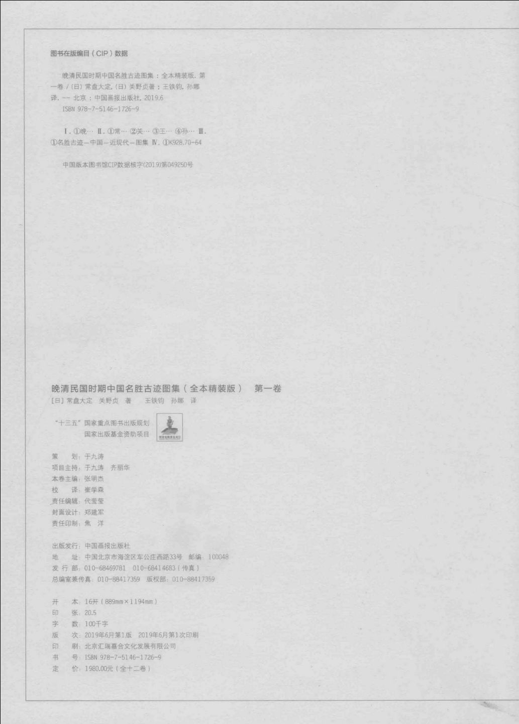 《晚清民国时期中国名胜古迹图集》(原书名《中国文化史迹》)由东京大学教授关野贞和日本古建筑学家常盘大定合著,于1941年出版发行。原书为日文版,按民国时期的行政省区进行分类编辑,全书共计图版2531幅,分12卷,每一卷附有10万字左右的解说。
