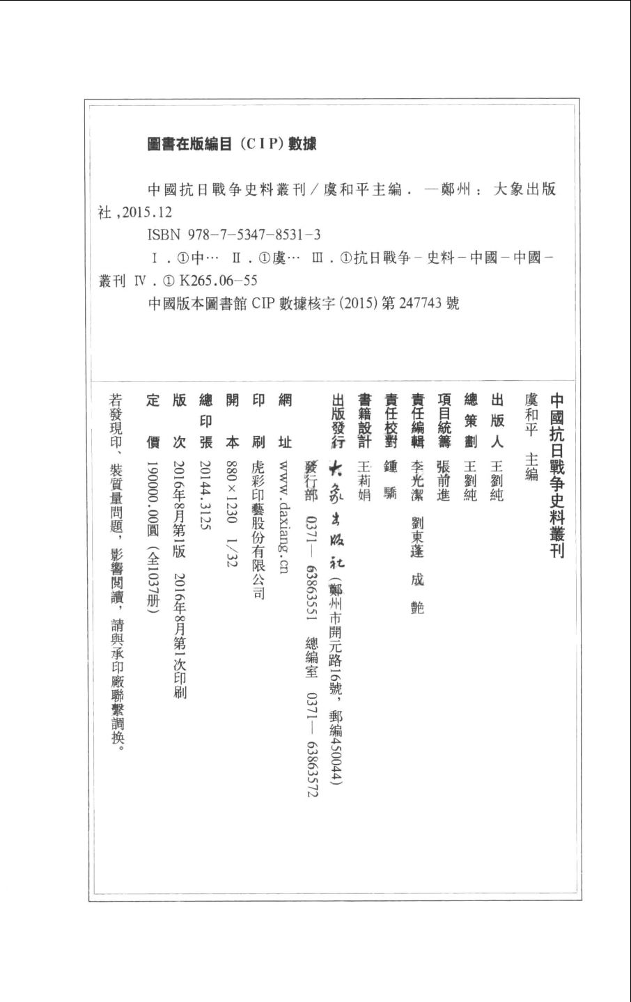本丛刊是一部全面反映中国人民反抗日本帝国主义侵略战争的大型历史文献丛刊,所收集文献种类之多,涉及范围之广,超过以往任何同类文献丛刊,为抗日战争史研究汇集和开发了众多的史料。辑入的文献以全国各大图书馆所收藏的1931—1945年间国内出版的中文书籍为主,其中海外图书馆馆藏者1000余种,兼及部分此年限之外的与抗日战争密切相关的文献史料。所辑文献资料凡4400余种,约65万页,分卷为1037册,是迄今为止国内外出版的有关中国抗日战争的规模最大、品种最全的历史文献资料库。