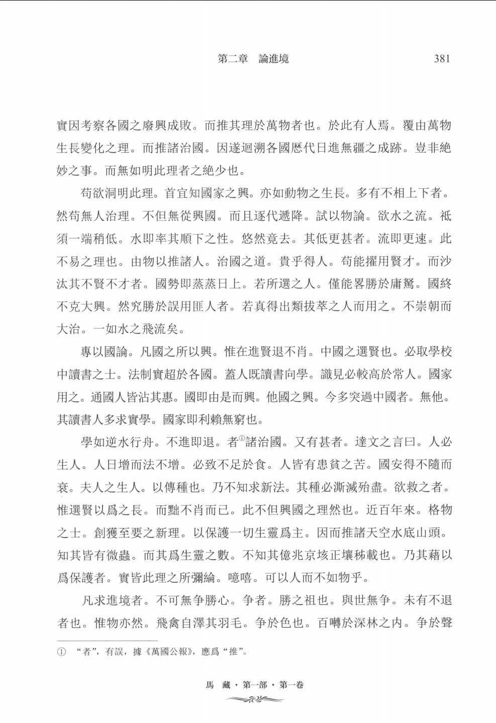 《马藏》(1—5卷),主要是对国内1904年之前的与马克思主义发展相关文献和资料进行汇集、整理、编纂与文本再现,并对原始文献作学术研究和考证,对版本、作者、出版单位等作必要的说明,对原文中的重要词汇、用语和关键词的内涵和演变作必要学术考证和说明。第 一部前5卷文献主要包括《百年一觉》《回头看》《富民策》《大同学》《俄罗斯大风潮》《帝国主义》《二十世纪之怪物帝国主义》《十九世纪欧洲政治史论》(华文祺译本)《十九世纪欧洲政治史论》(作新社译本)《十九世纪大势变迁通论》《社会改良论》《近世社会主义》《近世政治史》《社会进化论》《人群进化论》《世界进步之大势》《社会主义神髓》(达识译社译本)《社会主义神髓》(蜀魂译本)《社会主义神髓》(创生译本)《社会主义神髓》(高劳译本)《万国历史》《广长舌》《近世社会主义评论》《社会主义》(《翻译世界》连载本)《社会党》《最新经济学》