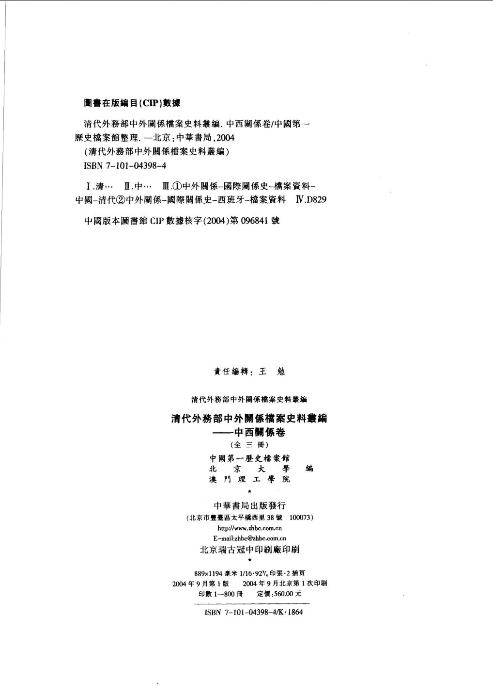 本书辑录了有关中国与西班牙外交关系档案806件,时间为同治三年至宣统三年。全书包括国书、昭会、条约、信函、电报等,内容涉及两国互设使领馆、呈递国书、通商贸易、案情审理、文化交流等史料。本书辑录了有关中葡关系档案553件,时间为同治元年至宣统三年。全书包括国书、昭会、条约、信函、电报等,内容涉及两国互设使领馆、呈递国书、通商贸易、澳门事务、文化交流等史料。其中,“中葡关系”卷辑录档案五百五十三件,时间起自一八六二年,止于一九一一年。“中西关系”卷辑录档案八百○六件,时间起自一八六四年,止于一九一一年。中葡关系的档案内容大部分曾公布出版过,中西关系的档案则全部为首次公布出版。两部史料涉及的内容主要包括,租地划界、互设使领、交聘往来、侨务招工、通商贸易、兴办实业、法律审判、文化交流、慈善赈济、订立条约等十多个方面。