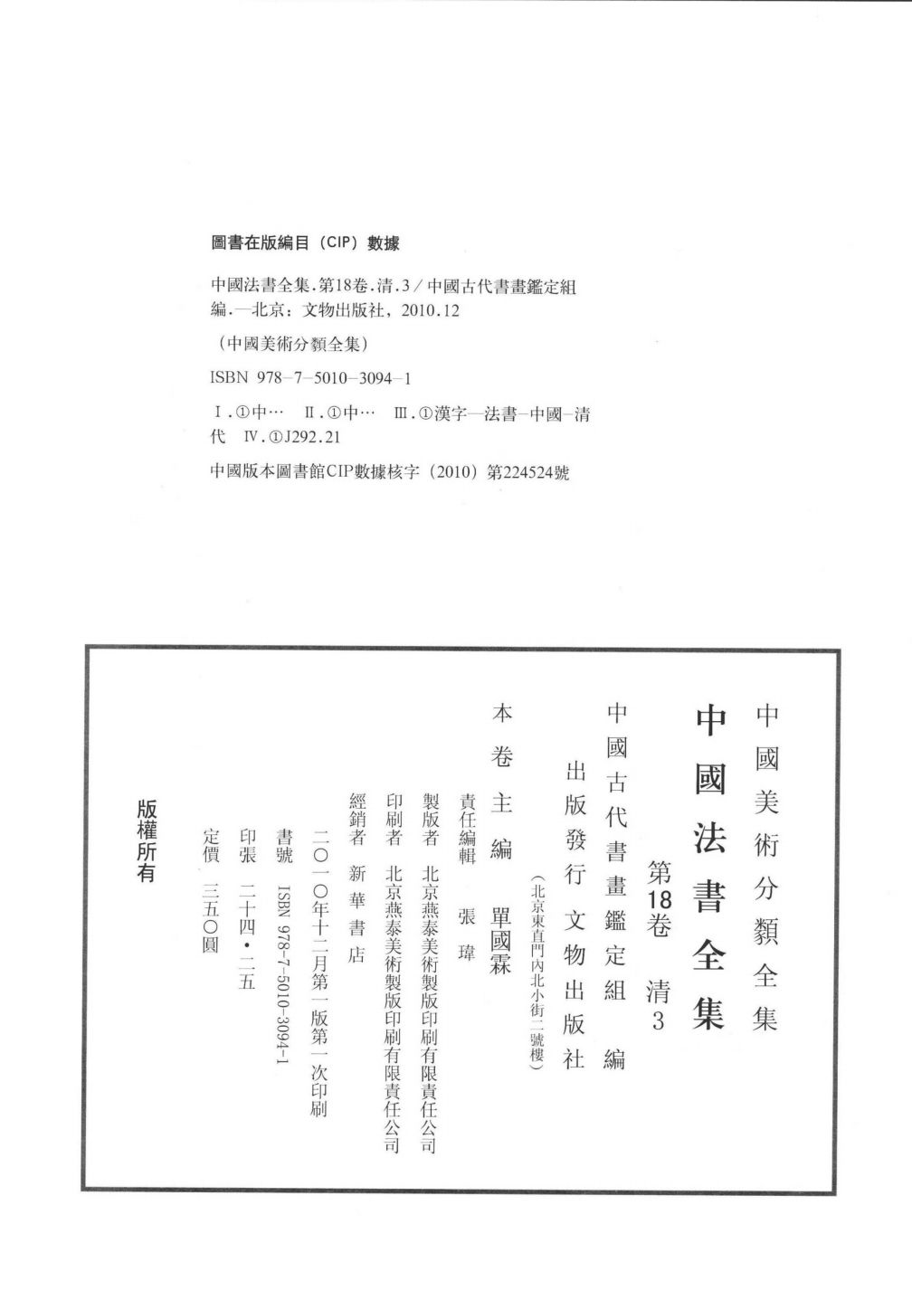本书是中国美术分类全集中的中国法书全集,共18卷,主要收录的是从先秦到清代的书法(墨迹)作品,使人们对中国古代的书法有一个更加全面的认识。