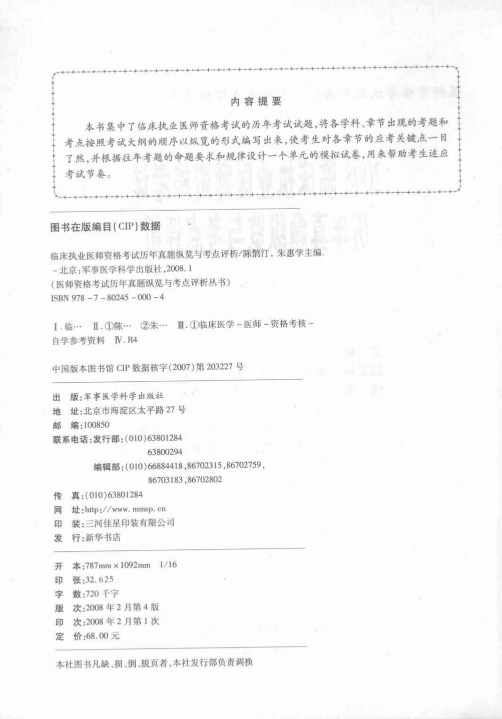 017401_2008临床执业医师资格考试历年真题纵览与考点评析 第4版_陈鹊汀,朱惠学主编_北京:军事医学科学出版社_2008.pdf 171.58 MB