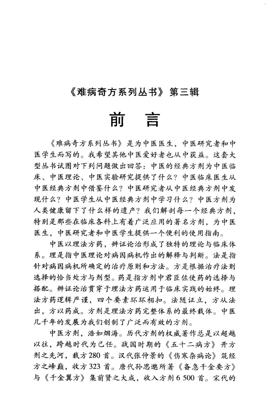 《难病奇方系列丛书》新的一辑-第四辑又和大家见面了。中医药是中华文明的一份宝贵遗产。在这份遗产中,中药方剂是一串串夺目璀璨的明珠,而那些百炼千锤、结构严谨、疗效可靠的经典名方则更是奇珍异宝。几千年来,经典方剂跨越时代,帮助中华民族健康生息、祛病延寿。它们并未因时代的变迁而消失,也未因社会的发展而萎谢,更未因西医学的创新而被抛弃。恰恰相反,它们应时而进,历久弥新。一代一代的学者丰富了经典方剂的理论内涵,一代一代的医生扩展了经典方剂的应用外延,面对西医学的飞速发展,经典方剂依然表现出无限的生命力和宽广的适用性。