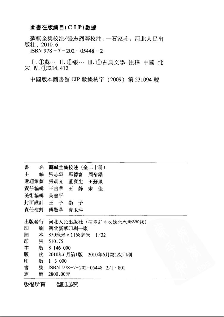 《苏轼全集校注》(全二十本),张志烈、马德富、周裕楷主编,河北人民出版社2010年6月第一版,