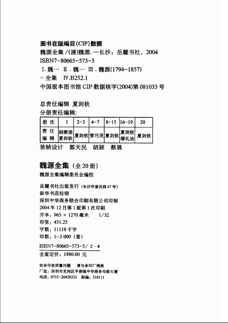 三是体例严谨,版式疏朗,印制精良。这套书的编辑,有一个体例较为周密的工作细则,从校记的写法、文字的规范、标点符号的使用到版式、字体、字号,都有严格的规定,其中如“书名号的使用”,审读中有专家认为可作为古籍横排本的规范予以推广。该书采用国际流行大32开,全20册,1100余万字。封面采用豪华精装,切口镀银防蛀。插图含魏源画像、三个故居和21种著作各版本的书影等彩图120余幅。
