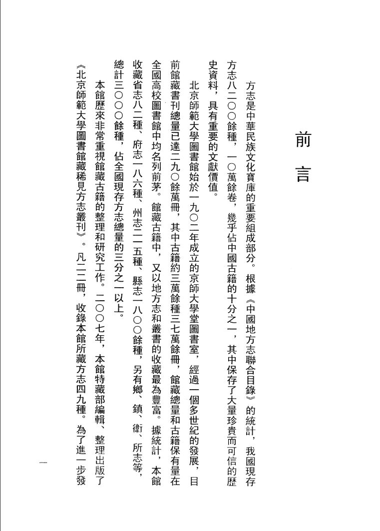 北京師範大學圖書館始於 1902 年成立的京師大學堂圖書室,經過一個多世紀的發展,目前館藏書刊總量已達 290 餘萬冊,其中古籍約 3 萬餘種 37 萬餘冊,館藏總量和古籍保有量在全國高校圖書館中均名列前茅。館藏古籍中,又以地方志和叢書的收藏最為豐富,據統計,本館收藏省志 82 種,府志 186 種,州志 215 種,縣志 1800 餘種,另有鄉、鎮、衛、所志等,總計 3000 餘種,佔全國現存方志總量的三分之一以上。