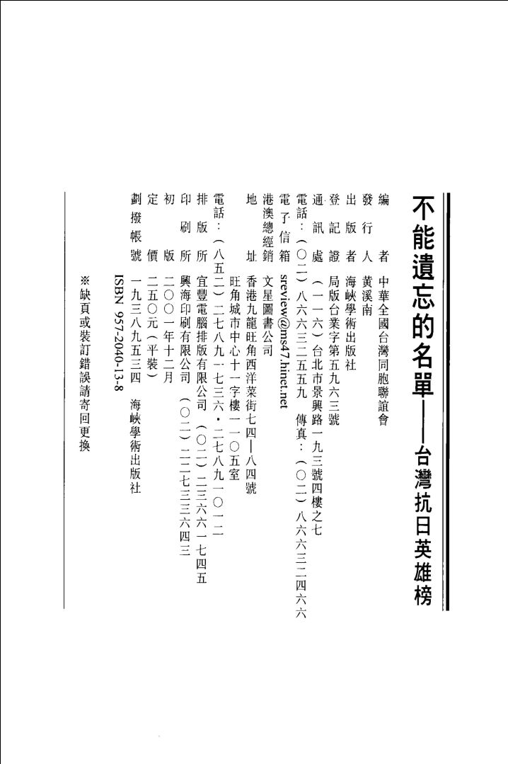 001不能遗忘的名单 台湾抗日英雄榜 中华全国台湾同胞联谊会编 海峡学术出版社 2001.pdf 183.91 MB