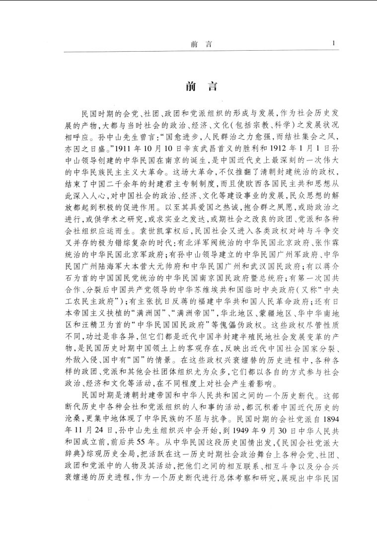 《民国会社党派大辞典》所收录民国时期的会党、政团、党派等词条的时限,上自1894年11月24日兴中会成立开始,下至1949年9月30日中华人民共和国成立前为止,前后共55年。但由于一些会社党派的组织情况不一,不宜“一刀切”,为考察历史衔接与组织演变,有些会社、党派编纂的上下限亦作适当延伸。