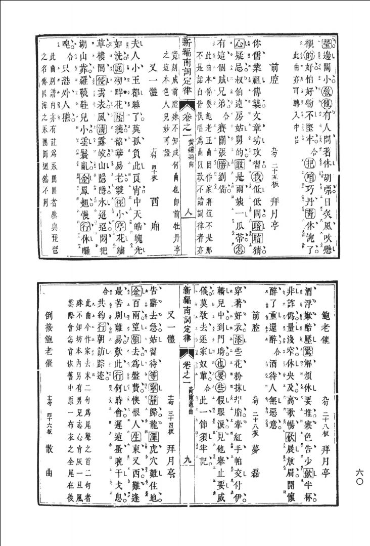 一是该书大而全,它几乎将古代刊印的经典曲谱全部影印。虽然近年来《四库未收书目辑刊》已将《南词定律》《九宫大成》等曲谱收入,但如《吟香堂曲谱》《太古传宗》《六也曲谱》等经典曲谱则欠收,《四库未收书目辑刊》中的《纳书楹曲谱》则失收《北西厢》。所以比较而言此书堪称完帙。