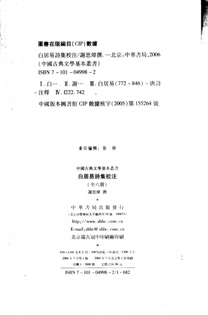(1) 本书为白居易全部存世诗歌的校注本,收入《白氏文集》中的全部诗歌作品及集外佚诗。