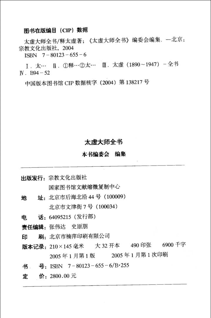 由宗教文化出版社、全国图书馆文献缩微复制中心出版的《太虚大师全书》,主要选自虚大师创办的刊物《海潮音》,同时参照1946年出版的《太虚大师全书》,在尽量保持原著内容的基础上适当修订整理。全书共分法、制、论、杂4藏共20编1440多篇目,700多万字,分35册,大32开,豪华精装。为了让这部“真经”普度众生,《太虚大师全书》采用简体横版方式,方便阅读。