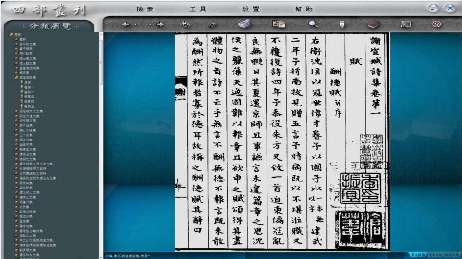 《四部丛刊》电子版保有纸张版本的全部内容,并使每个汉字数码化,从而实现字字可查、句句可检的快速全文检索,并且提供了摘要、笔记、纪元换算以及简、繁、异体汉字相互关联查询的功能。