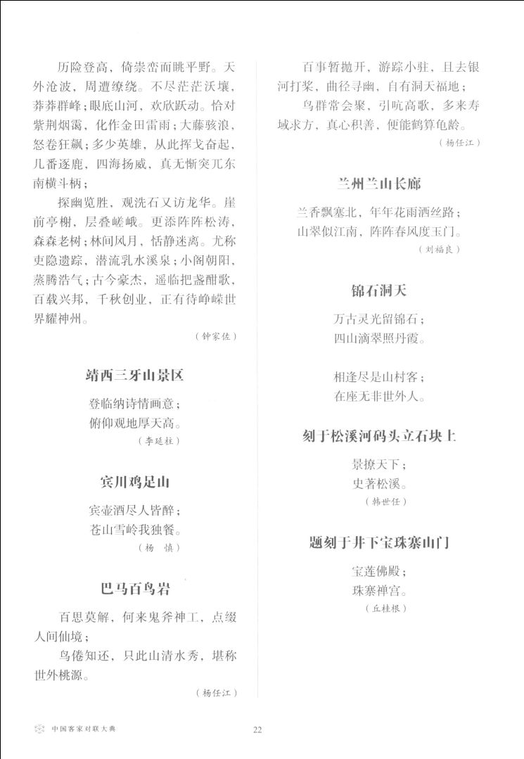 该书内容翔实,系统编排,包容丰富。所收录的客籍作品共分为地理名胜、姓氏祠堂、宅第居室、宗教庙宇、政务衙署、文教体育、行业商肆、婚寿赠贺、缅怀悼挽、时令节日、集句谐巧、征联求偶等12类。(记者张庆云)