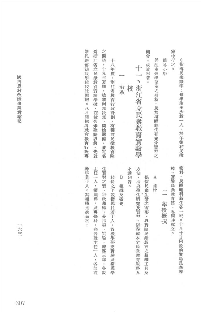 教育类为全书的第六五六—八七五册,主要内容为:一、教育行政,包括国民政府教育部工作报告、教育法规和全国性的教育会议等;二、教育社团,包括中华教育改进社、中国教育学会等教育社团的社务报告、简章、年报等;三、各地教育,包括各省市教育行政工作报告、年鉴、概览、地方性法规等;四、各级教育,涉及幼儿教育、初等教育、中等教育、高等教育、师范教育等方面,包括各级教育法规、课程标准等,以及学校概览、章程等;五、华侨教育,包括相关会议报告、教育方案、立案标准及指导书等。
