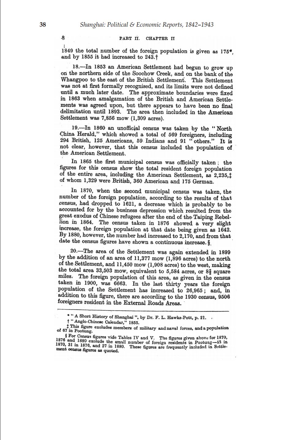 The remarkable and durable institution of the International Settlement allowed the British to report in detail on political and economic matters in Shanghai and China. This collection of primary documents, establishes a comprehensive series of despatches, in the main from the British consul in Shanghai to the British ambassador to China based usually in Peking, but in the 1930s based in Shanghai itself. The form and extent of communications vary during the period, and include annual reports and trade returns, judicial reviews, despatches on topics of interest and telegrams on urgent matters. After 1920 series of quarterly political reports and six-monthly intelligence summaries are initiated, and some other irregular periodic reports emerge. There is regular information on the government of the Settlement, and reports on the opium trade; there are extended reports, in 1856, on the continuing Taiping Rebellion, and later, reports on the Sino-Japanese war over the control of Korea; from 1901-11 reports include: the Boxer Rebellion; commentary on the French settlement; anti-government conspirators in Shanghai; the Russo-Japanese war; the Shanghai tramway system; the bubonic plague in Shanghai; the Chinese revolution of 1911-12; British intelligence reports on German activities, 1914-18; and in the mid-1920s telegrams reflect the impact of the civil war in China, and report “the Shanghai incident”. The collection of documents ends with the winding up of the Settlement under wartime Japanese occupation, and numerous papers in 1942 carry discussion of this conclusion.