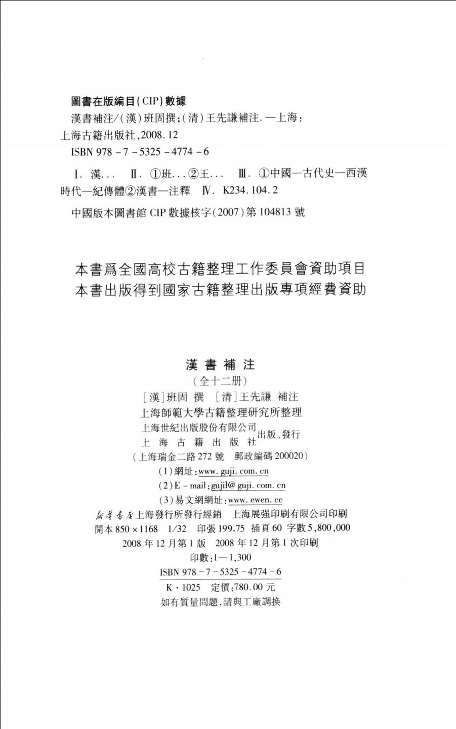 在中国史学史上,《汉书》是与《史记》地位并隆的史学名著,历来研习注释者代不乏 人,最负盛名者,前有唐颜师古,荟萃先代23家注疏,参以己意;近有清王先谦,征引注解百余家,亦加精辨。王氏之集注多吸收清代如王念孙父子等训诂大家之精良成果,不但能发前人所未发,亦能纠正颜氏之失,诚为研读《汉书》者之首选。中华书局1962年出版《汉书》标点本,用《汉书补注》本作为底本,惟限于当时历史条件,仅收入颜师古注而未收王先谦补注。今则汇集专家,以清光绪二十六年(1900)王氏虚受堂刻本为底本,吸纳商务印书馆1937年版百衲本、中华书局标点本以来的研究成果,将《汉书补注》全本予以整理标点出版,以惠学者。