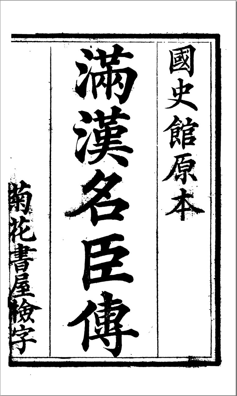 《满汉名臣传》一书又名《满汉大臣列传》《国史列传》《满州名臣传》,是一部传纪类史书,它收录了自天命元年至嘉庆初年以满汉大臣为主的人物列传,其中也有蒙古族等少数民族大臣的人物列传,下面分别加以论述。 一、《满汉名臣传》一书的作者及其版本源流 《满汉名臣传》一书的作者究竟是何人?根据一些资料证明,笔者认为是清国史馆编撰.首先,该书的书名页或书口都标有“国史馆撰”的字样,清代大臣李桓编纂的《国朝替献类征》一书卷首“述意”一文详细阐明了此书的部分史料来源,在阐述书中国史列传部分时写道:“本人有国史馆本传者均将史传首列,次及诸家文字,唯史馆故事止准史官就馆抄录,不得将原本携归私寓。先文恭公,先编修兄叠,直史馆均不过二三年,就抄无多,嗣属在馆戚友续抄,仍属无几,是以应有史传而闹载者甚多”。