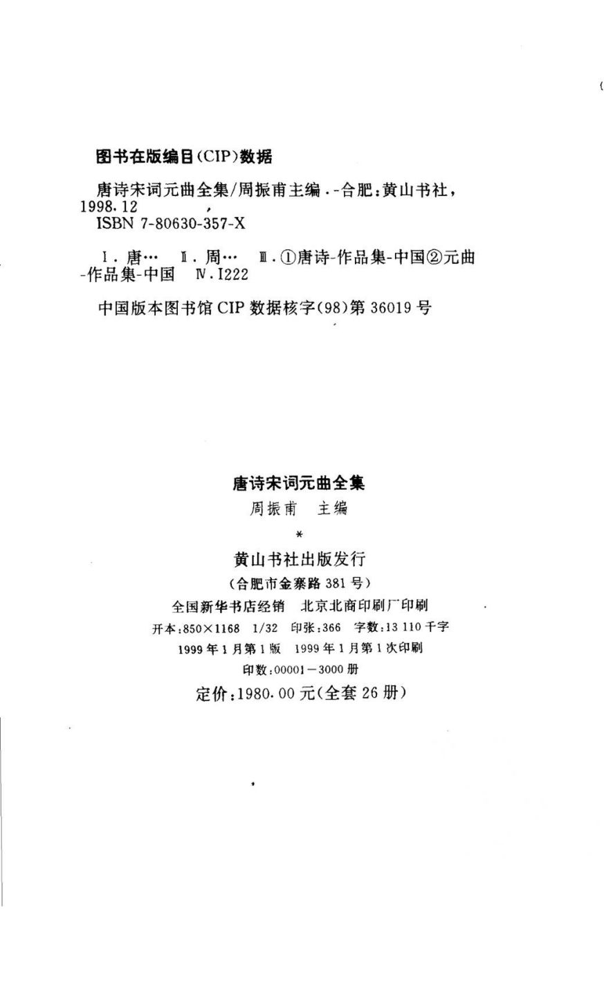 全套书包括三个部分:《全唐诗》收入2830多人的57900多首诗;《唐宋全词》收录了1530多人的22000首词;《全元散曲》收录了209人的1064首散曲。周振甫 - 1911~2000,浙江平湖人著名学者,古典诗词、文论专家、资深编辑家主要著作:《中国文章学史》等 1911―2000,浙江平湖人,我国著名古典诗词、文论专家,资深编辑家曾在上海开明书店、中国青年出版社、中华书局等处任编辑工作主要著作有:《毛主席诗词浅释》《鲁迅诗歌注》《诗词例话》《文章例话》《中国修辞学史》《中国文章学史》《严复思想评述》《周易