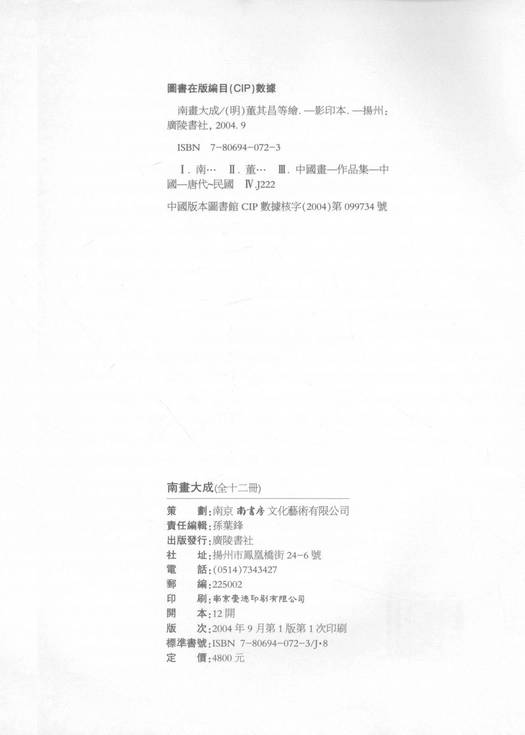 《南画大成》原书成书于日本昭和十年,即西元一九三五年。本书将中国画历代名作几乎一一罗列,但没有采用当时尚健在的画家的作品。另外,有些画作虽属北宗,但是在南画的发展史上不可或缺,出于参照的目的,也收载其中。原书依据画家的年代而排列,但对生卒年月不明的画家,不免有前后的差池。本书原书包括附册及题跋集凡二十二卷,本次重印后分为十二册,但对原书顺序不加丝毫变更,只将各卷目录集中于前。